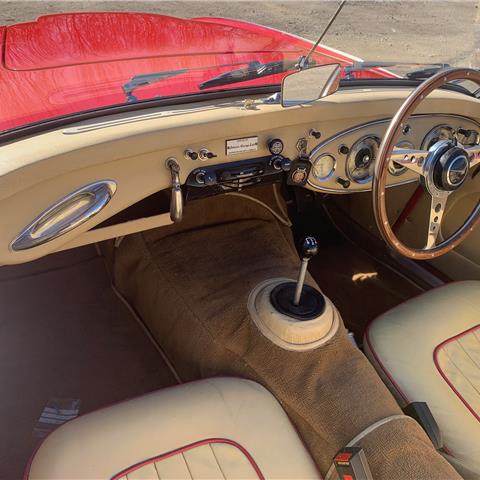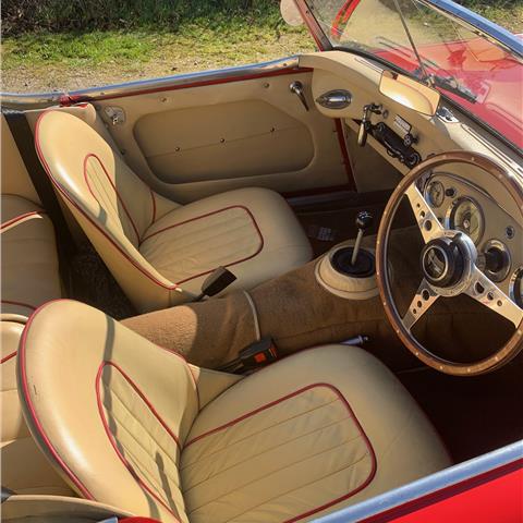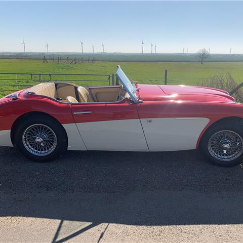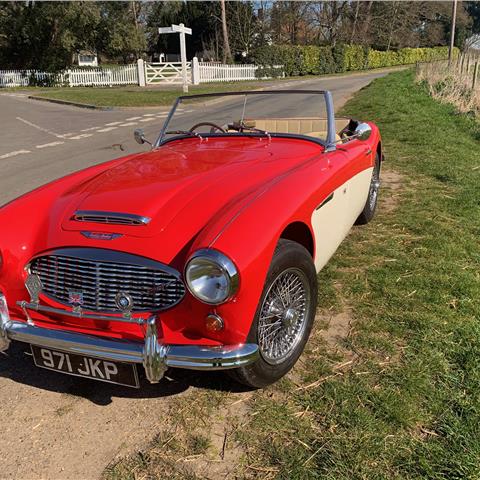 1960 Healey 3000 Mk1 BT7. Fully restored by 2000 to a high standard and has done very few miles since. Kept in a dry warm garage. Great condition throughout and a really good driver. New hood and tonneau cover. Chromed wire wheels. Red over old English white bodywork with cream leather upholstery with red piping. Good tyres all round and has just passed a full MOT 18/3/2022. Heritage Certificate and a box file of paperwork showing the cars history. Available for viewing. |
